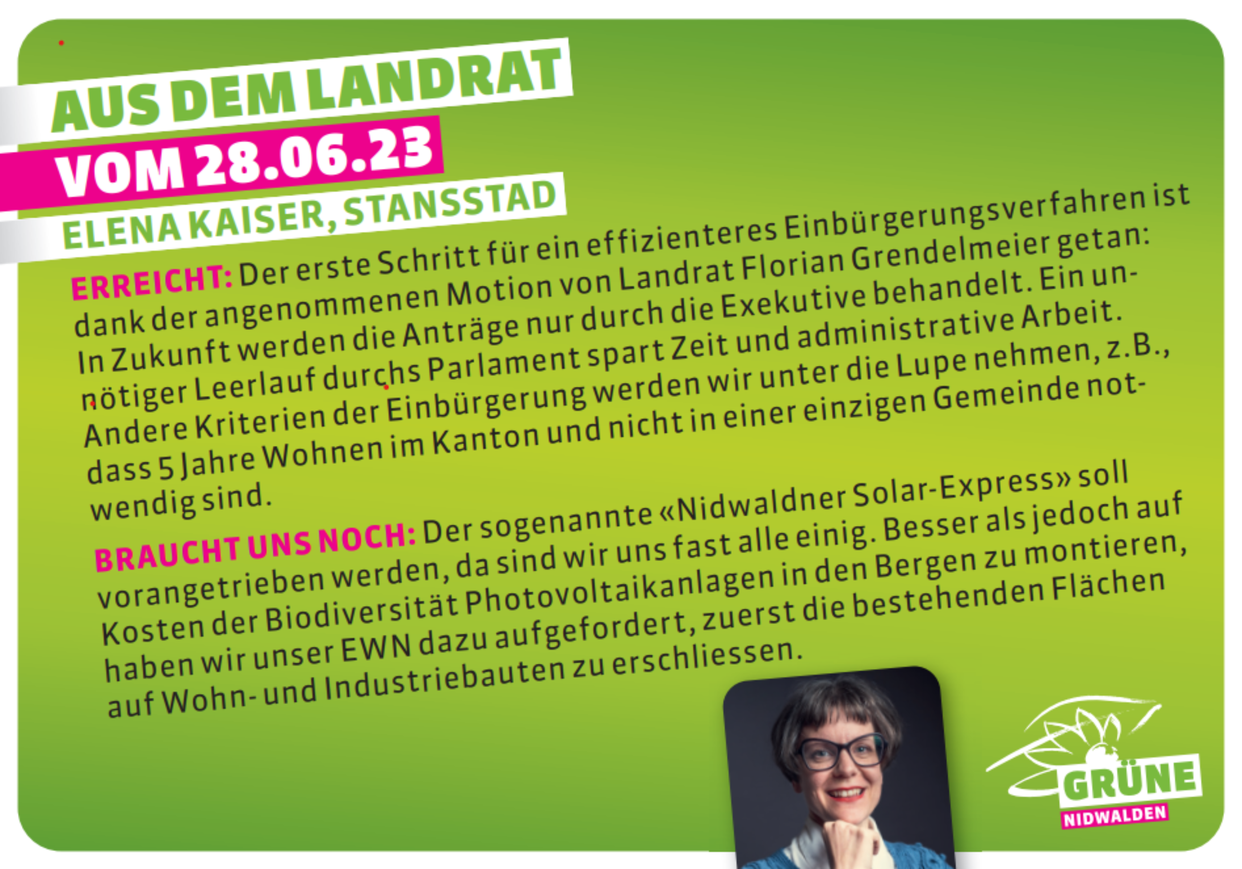 Der sogenannte „Nidwaldner Solar-Express“ soll vorangetrieben werden, da sind wir uns fast alle einig. Besser als jedoch auf Kosten der Biodiversität Photovoltaikanlagen in den Bergen zu montieren, haben wir unser EWN dazu aufgefordert, zuerst die bestehenden Flächen auf Wohn- und Industriebauten zu erschliessen.