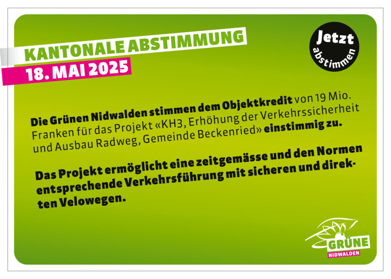 Die Grünen Nidwalden stimmen dem Objektkredit von 19 Mio. Franken für die Planung und Umsetzung des Projekts «KH3, Erhöhung der Verkehrssicherheit und Ausbau Radweg, Gemeinde Beckenried» einstimmig zu.