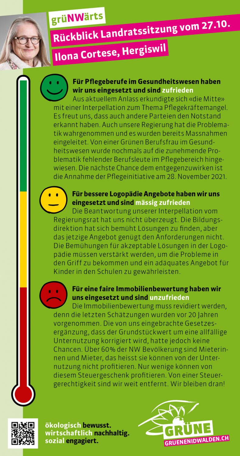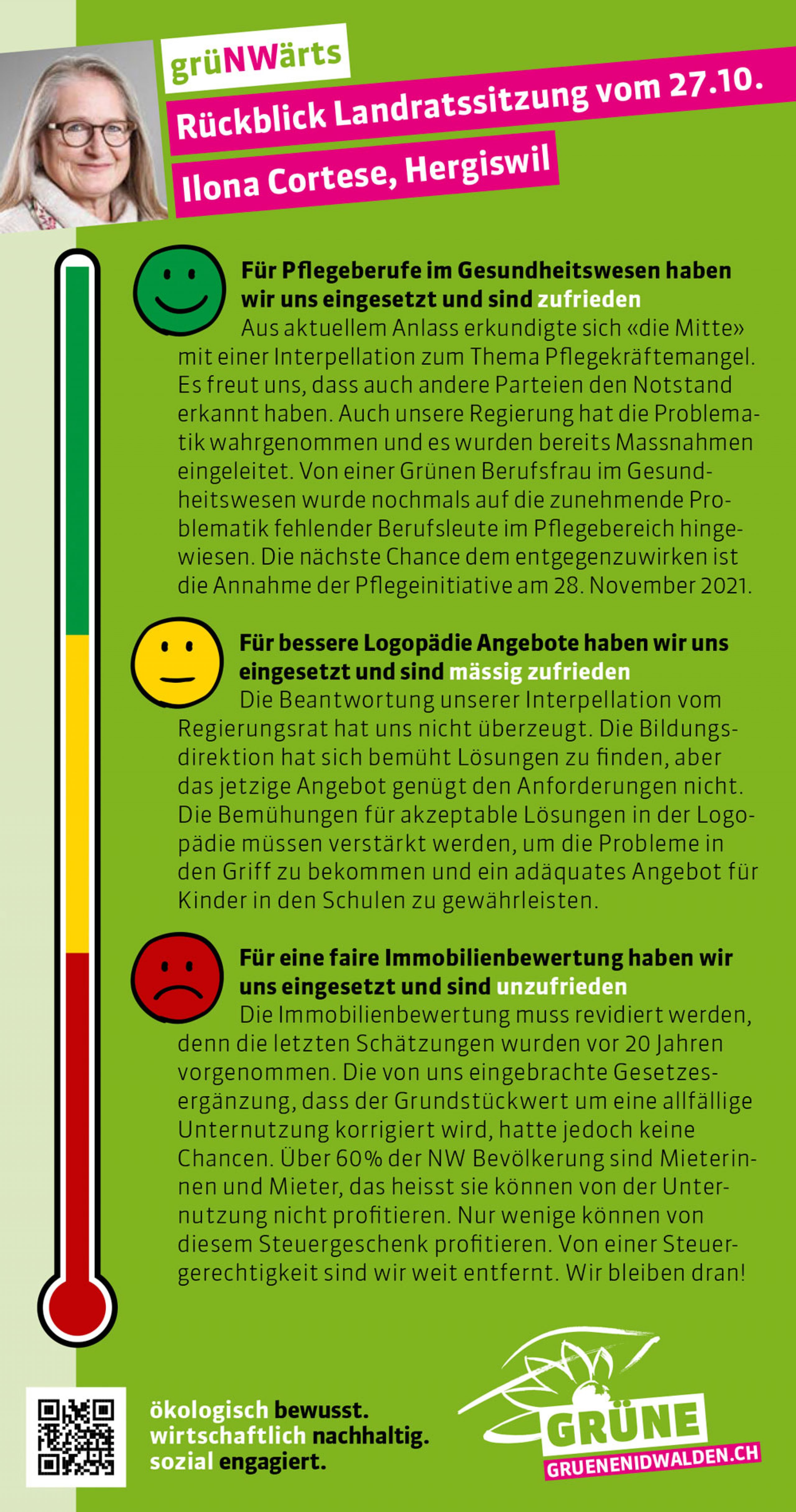 Zudem behandelte der Landrat eine Interpellation betreffend des Pflegefachkräftemangels. Die GRÜNEN stellen fest, dass die Problematik vom Regierungsrat erkannt wurde. Zur Immobilienbewertung haben wir Gesetzesergänzungen eingebracht, weil 60 % der Nidwaldner:innen nicht vom neuen Gesetz profitieren können. Unsere Anträge hatten jedoch keine Chancen. Wir bleiben dran!