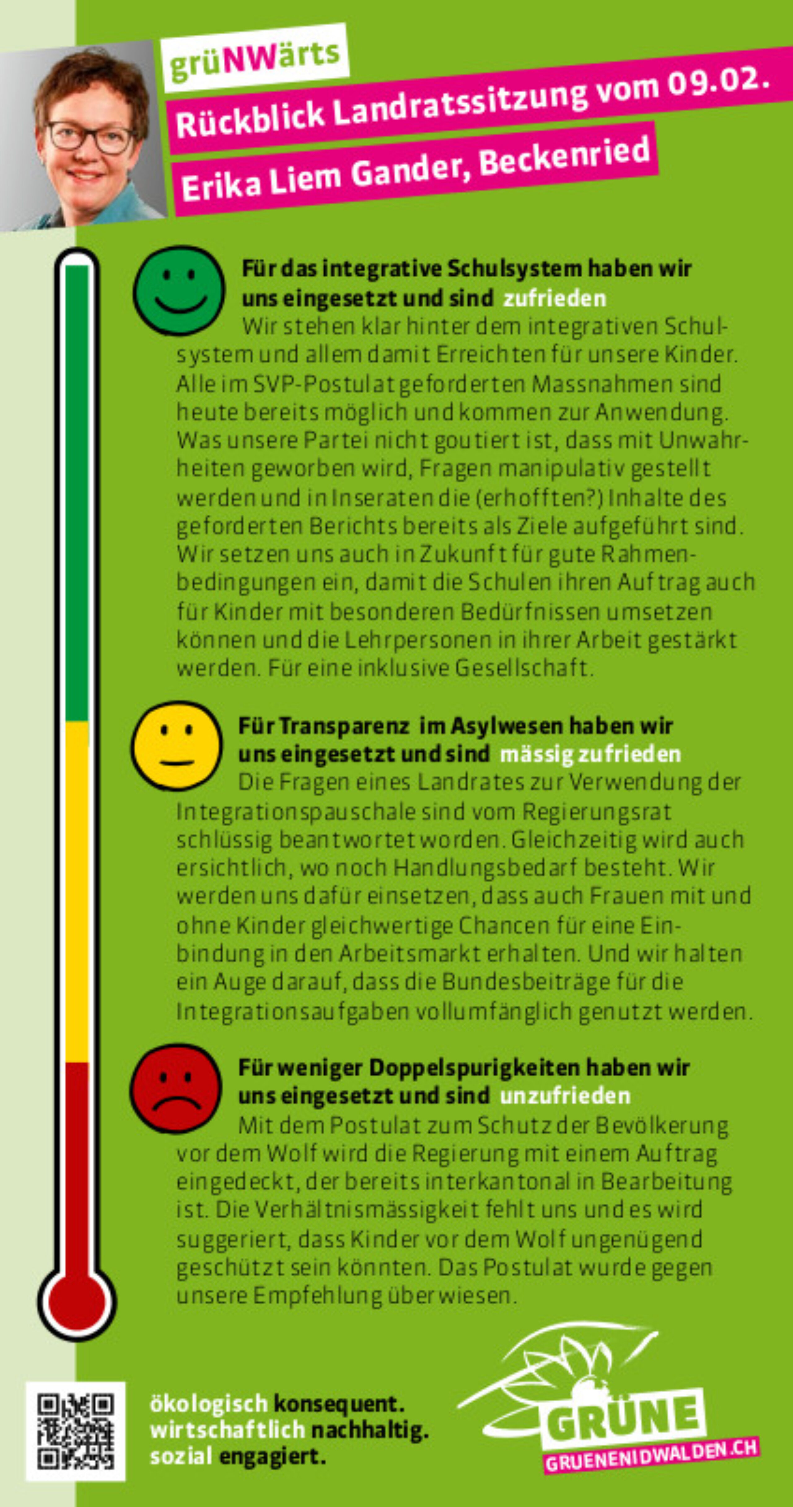 Wir stehen klar hinter dem integrativen Schulsystem; Für Transparenz im Asylwesen: Dafür haben wir uns eingesetzt und sind mässig zufrieden; Mit dem Postulat zum Schutz der Bevölkerung vor dem Wolf wird die Regierung mit einem Auftrag eingedeckt und es entstehen Doppelspurigkeiten: Damit sind wir nicht zufrieden!